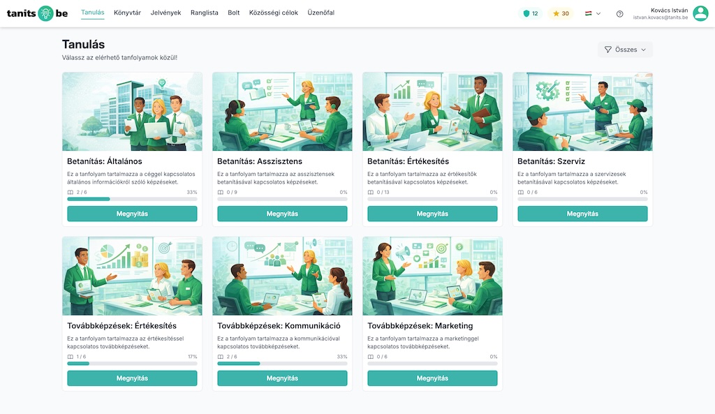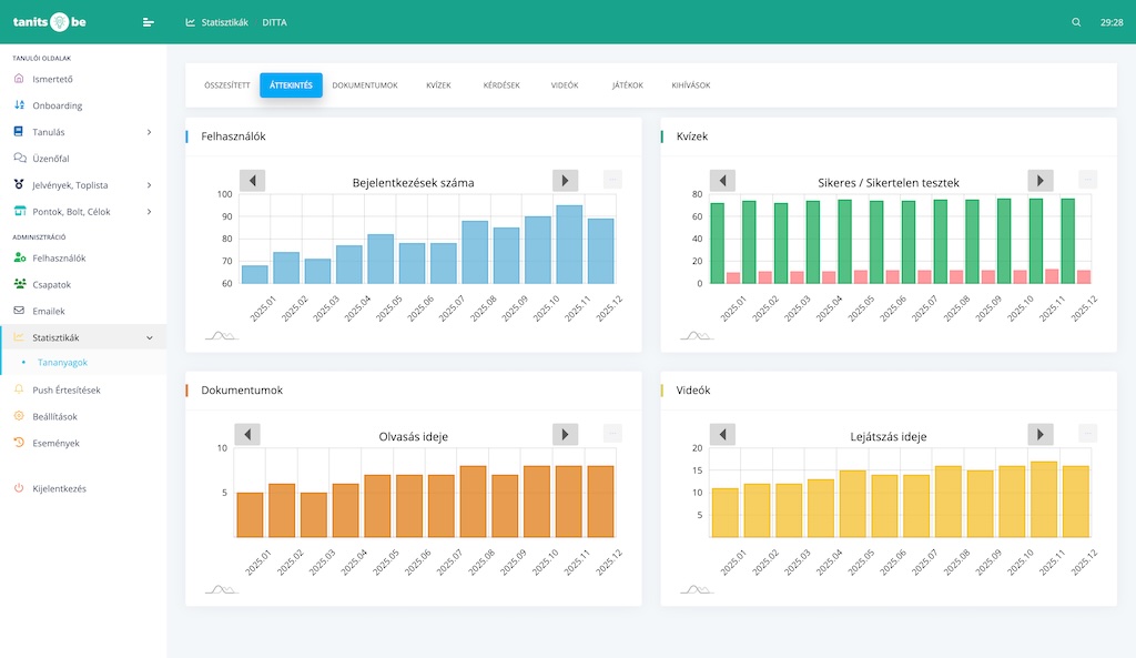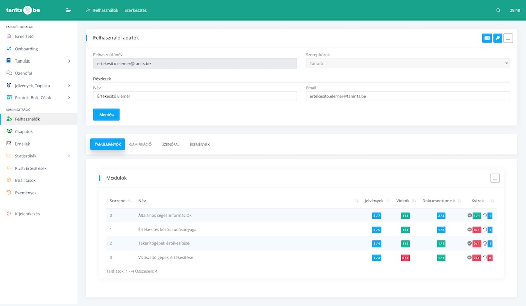 A tanits.be adminisztrációs felülete a vállalati oktatási folyamatok egységes kezelésére szolgál.