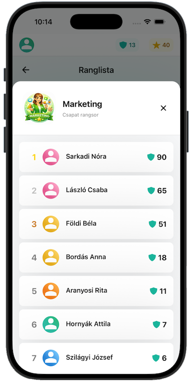 A jelvények, pontok és ranglisták támogatják az aktivitást. A teljesítmények egyéni és csapatszinten is megjelennek.