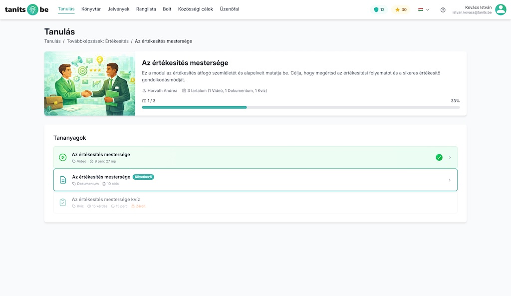 A rendszer folyamatos visszajelzést ad az aktuális státuszról. Látható a teljesített tartalom és a még hátralévő tanulási lépések.